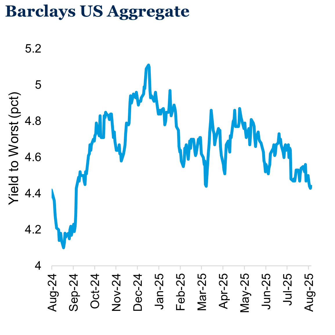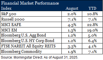 Outside the U.S., international equities extended their lead. Developed markets, represented by the MSCI EAFE, advanced 4.3% in August and are now up an outsized 22.8% year-to-date. Japan was a standout, driven by tariff revisions and structural improvements to its economy, while Germany and France trailed the pack. Emerging markets posted a modest 1.3% gain for the month, but remain up 19.0% for the first eight months of the year. Strength in China, supported by targeted policy action, and in Brazil, fueled by strong corporate earnings and attractive valuations, helped offset weaker performance elsewhere.