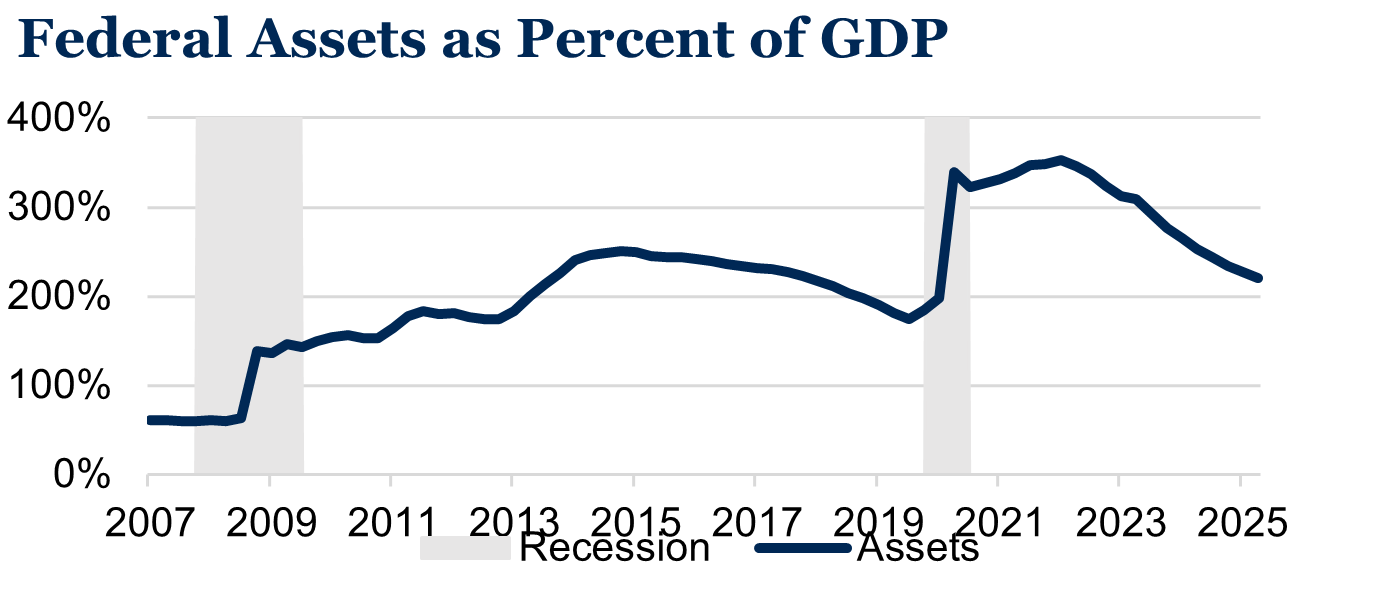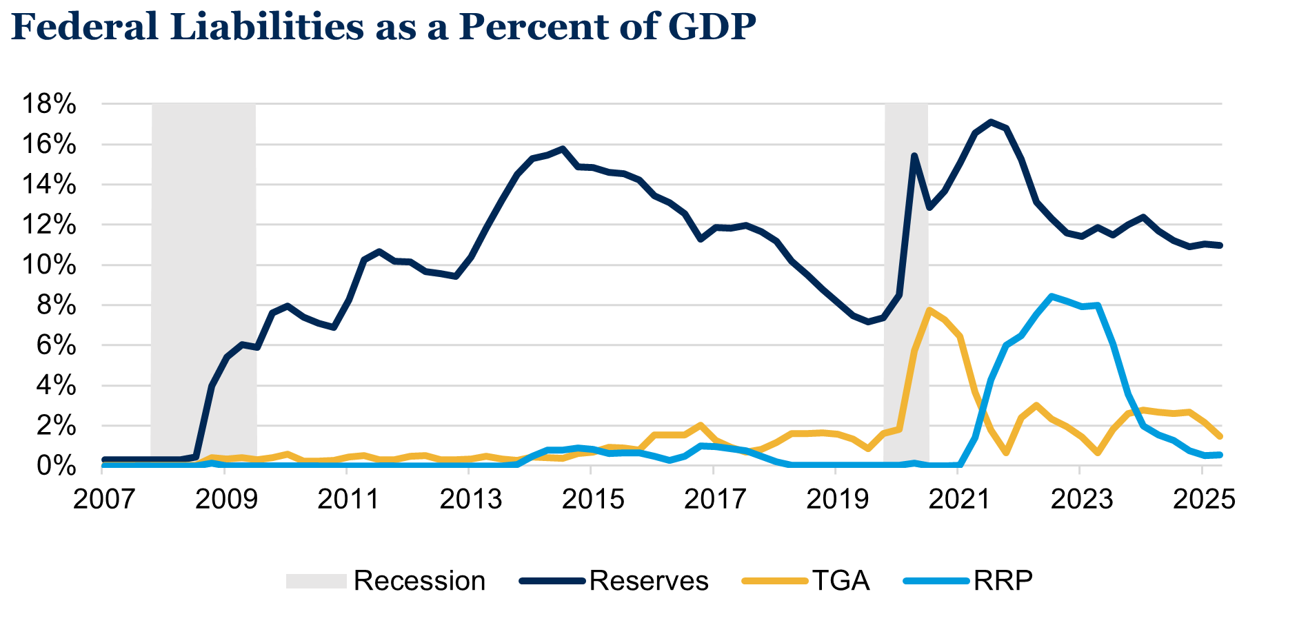 The Federal Reserve remains committed to balance sheet runoff. Quantitative tightening (“QT”) by passive maturity is a slow process. Assets roll off month after month, shrinking reserves on the liability side of the balance sheet.