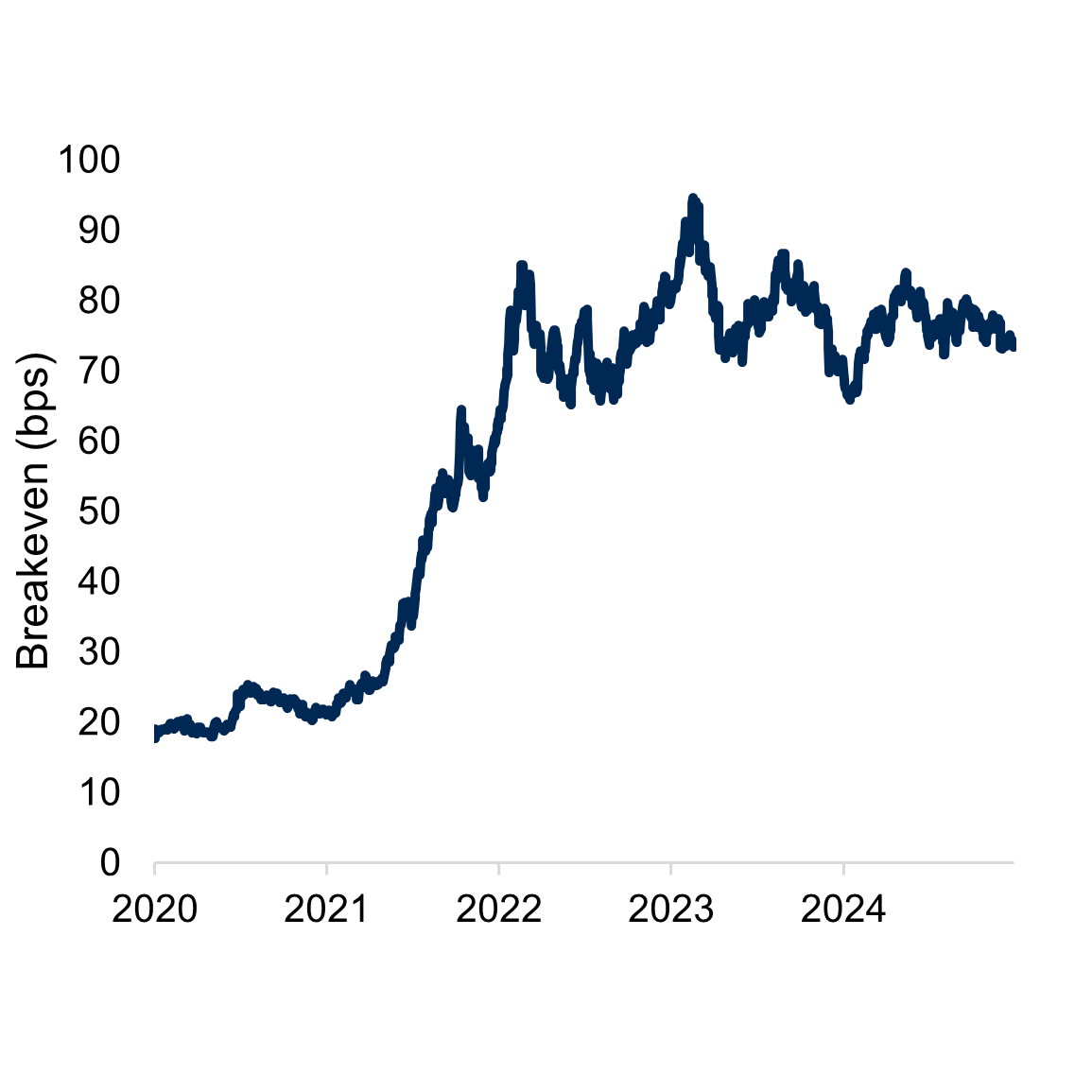 The Barclays US Aggregate, the benchmark for core bonds, currently has a breakeven yield change of 74 basis points. Over the past year, index yields have risen by an average of 44 basis points. This implies a core duration allocation can absorb an average move higher in rates, illustrating how we incorporate durability into portfolios while retaining upside should rates fall.