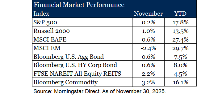 November’s market action was defined by turbulence. The S&P 500 fell over 3.0% during first three weeks of the month on fears of an AI Bubble. However, near the end of the month fears receded on expectations for interest rate cuts. Therefore, the S&P 500 posted a modest gain of 0.2%. Small caps, represented by the Russell 2000, outperformed with a 1.0% advance, hinting at a tentative rotation away from mega-cap dominance.