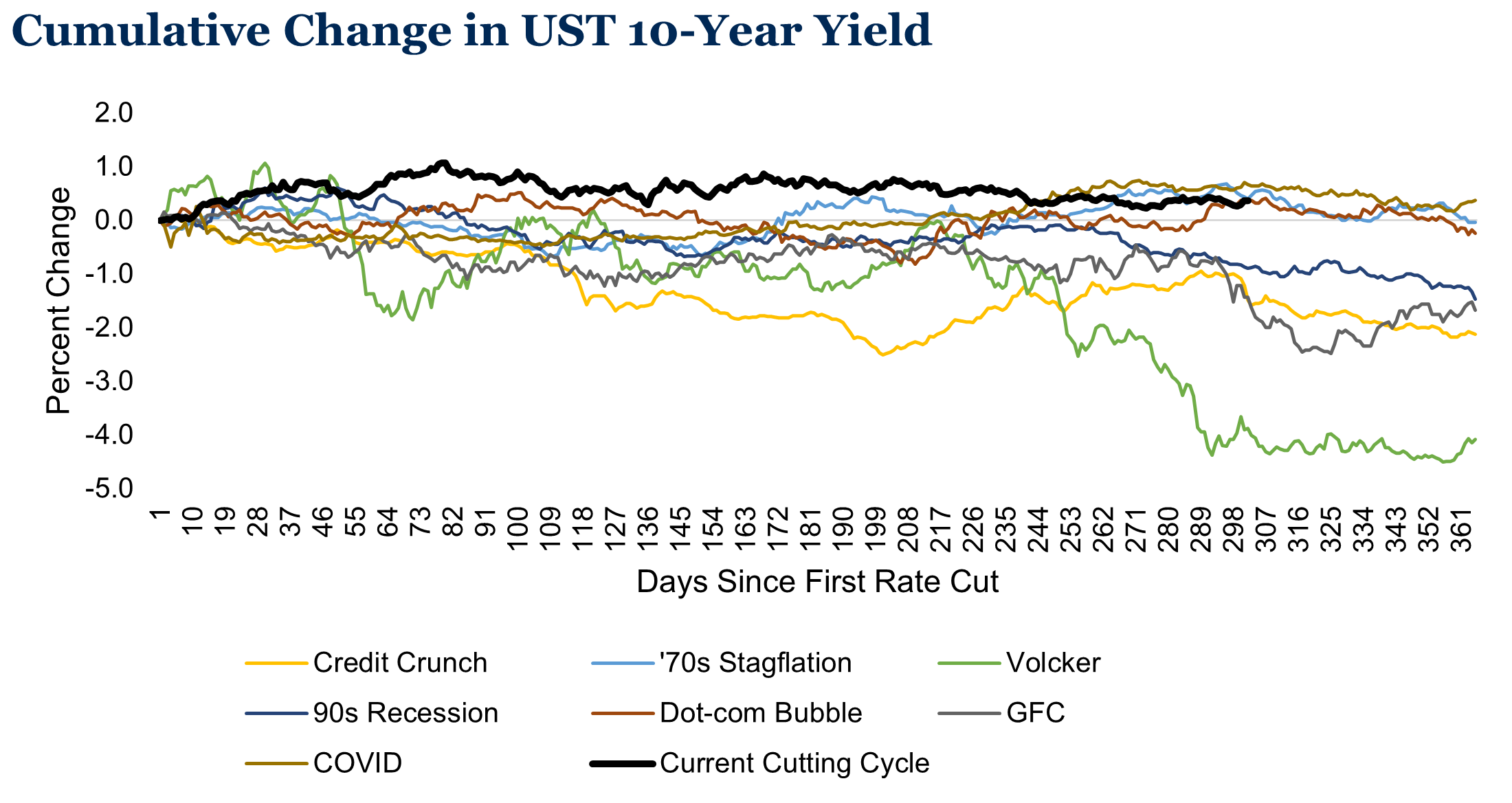 We have now had 150 basis points of rate cuts since the first cut in 2024. The bond market has exhibited a unique response to Fed action, with the long end of the curve persistently rising. In fact, the only significant historical period with similar market action was during 1970’s stagflation. Today, the bond market is seemingly pricing in similar concerns on inflation. This raises the question, what happens when the Fed stops cutting rates? For investors, active management in fixed income may help navigate what could be a non-linear rate environment.