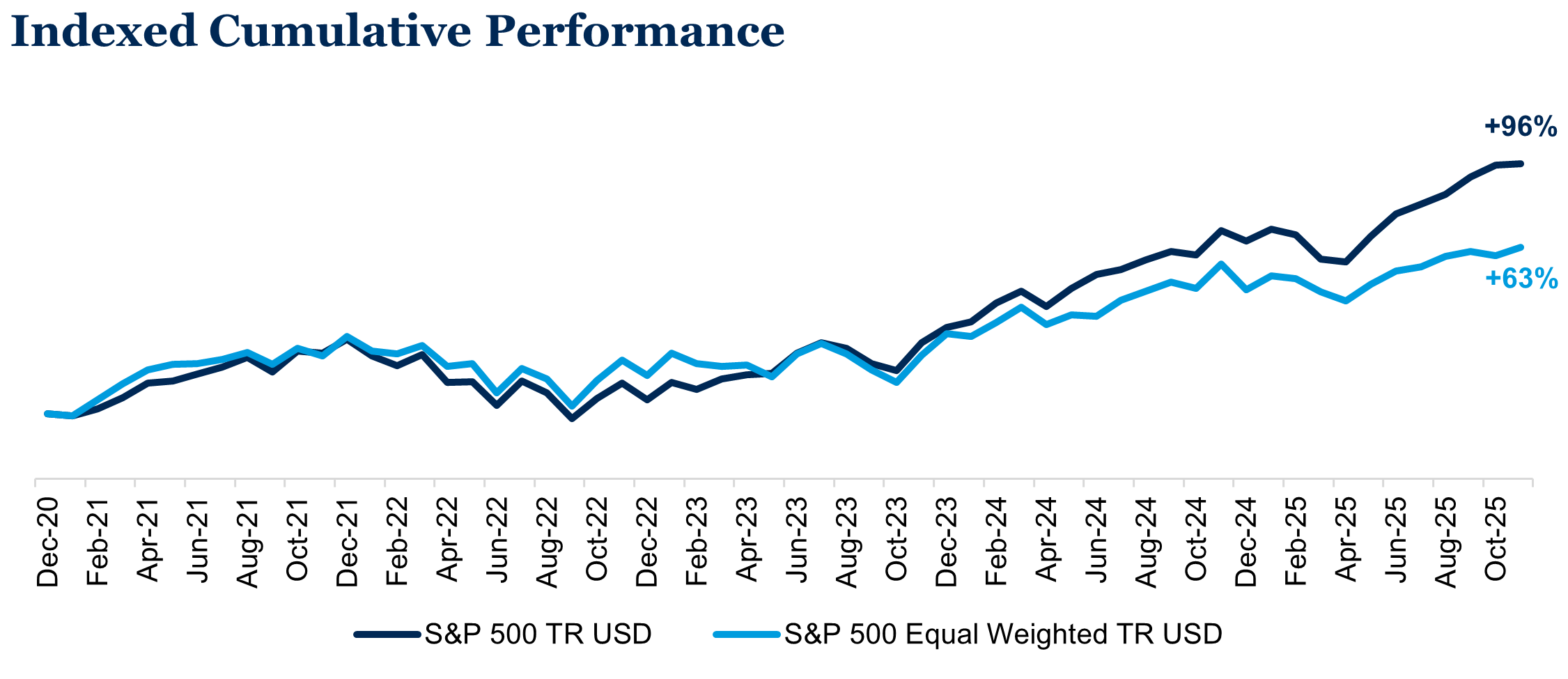 As the year winds down, markets remain supported by moderating inflation, stable monetary policy and a favorable corporate fundamental backdrop. However, elevated valuations, concentration driven by the strength in AI related securities, and persistent macro uncertainty call for thoughtful diversification and disciplined risk management. Our upcoming 2026 Investment Outlook will explore some of these themes in greater depth, and provide guidance for positioning portfolios in an evolving market environment as we head into the new year.