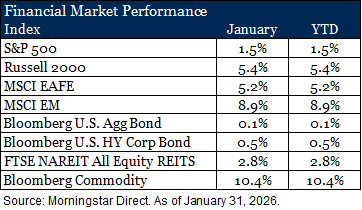 Diversifying areas of the markets such as REITs and commodities also opened the year in positive territory. U.S. Equity REITs gained 2.8% during January. The sector benefited from early signs of improving fundamentals in data centers, industrial properties and select residential markets. Concerns around office properties persisted, but strength in other areas outweighed the drag. Commodities delivered the most notable performance of the month. The Bloomberg Commodity Index surged 10.4%, driven by strength in energy and industrial metals. Energy prices, particularly crude oil and natural gas, moved higher as extremely cold temperatures swept across much of the country. Precious metals saw favorable returns as well, although gold prices sold off at the end of the month, limiting the gains.