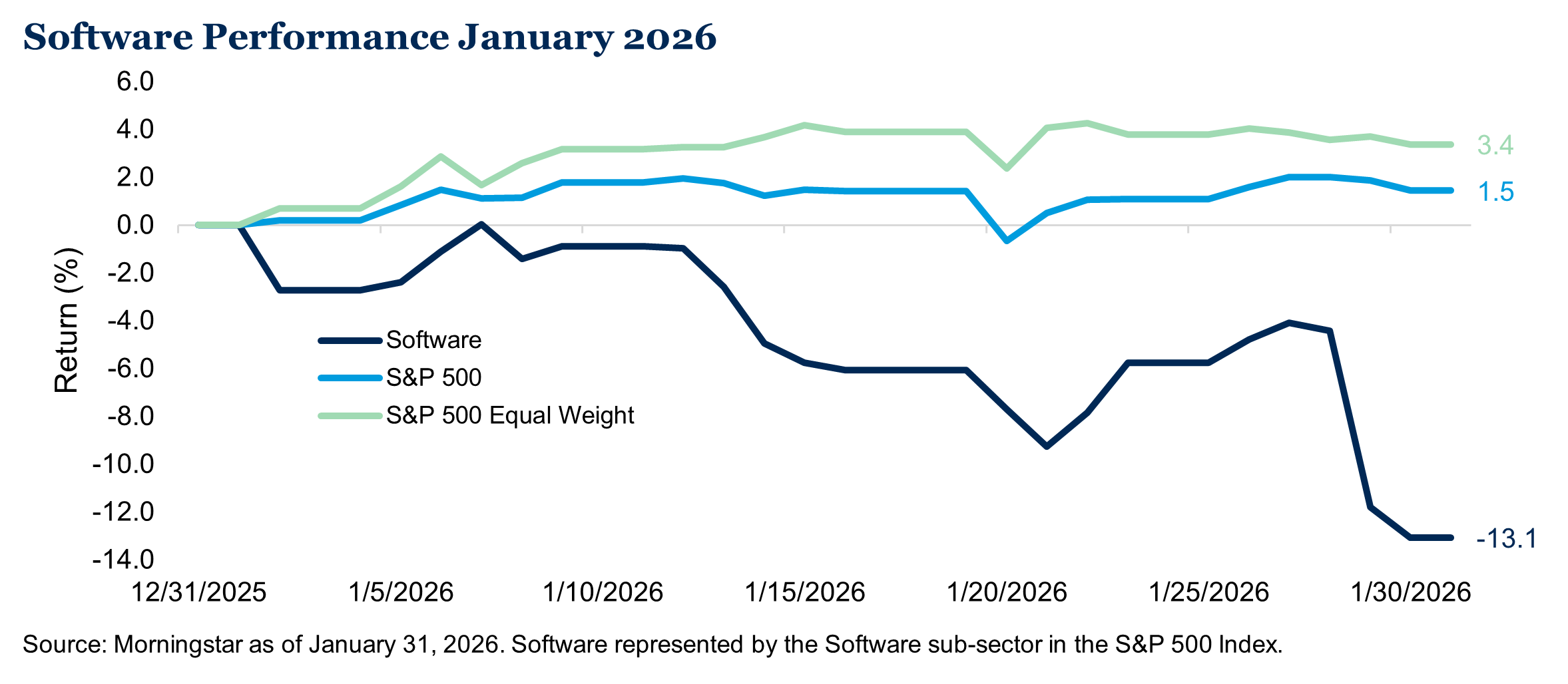 January brought mixed impact from AI during the month. We discussed the potential for disruption and displacement from AI as part of our “AI Playbook” theme in our 2026 Outlook. Investor concerns took hold about the potential disruption generative AI would have on software companies during the month following a new tool for Anthropic’s Claude large language model that can help with tasks for legal, marketing and data analysis. Shares of Oracle and Salesforce fell over 15% and 19%, respectively, for the month and resulted in the software sector being down 13.1%, wiping out nearly $800 billion in market value. On the other hand, semiconductor companies, particularly abroad, continue to benefit from the demand for chips and flash memory. Emerging markets were a standout in the month. Among the top contributors were Taiwan Semiconductor, up 14.3% in January, and SK Hynix, up almost 40%. We highlighted in our Outlook that having thoughtful diversification to areas of the market such as non-U.S. equity and small and mid-cap U.S. stocks may help balance portfolios and capture the benefits from a broadening of AI, and we are seeing this take shape so far in 2026.