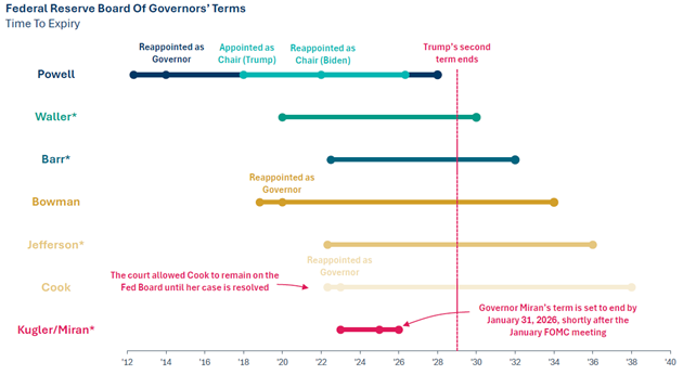 If the Federal Reserve lost its independence, its hard-earned credibility would quickly dissipate. The costs to the economy would be incalculable: Higher inflation, lower standards of living, and a currency that risks losing its reserve status.” We discussed the FOMC structure in depth in our May Market Review last year, Imperfect Independence. Our stance remains the same, that the institutional design should minimize short-term political influence and based on the current terms (depicted on the previous page), the current administration has limited ability to appoint new governors assuming terms are served in full.