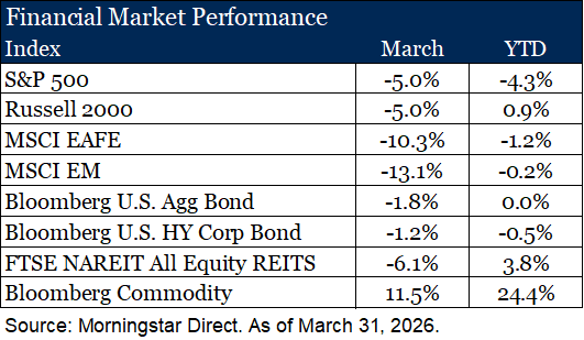 • In March Markets gave up much of the gains they had generated for the quarter as the Iranian conflict persisted. Stocks sold off on sentiment and rates rose based on inflation concerns.